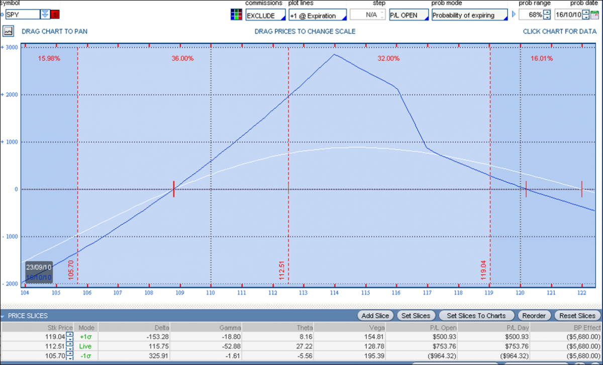 Con este ajuste lo que he hecho ha sido reducir el riesgo debido al desplazamiento, es decir, delta, aunque todavía sigue siendo positivo. Mis puntos de empate son 109 y 120, pero antes de llegar ahí habría ajustado.