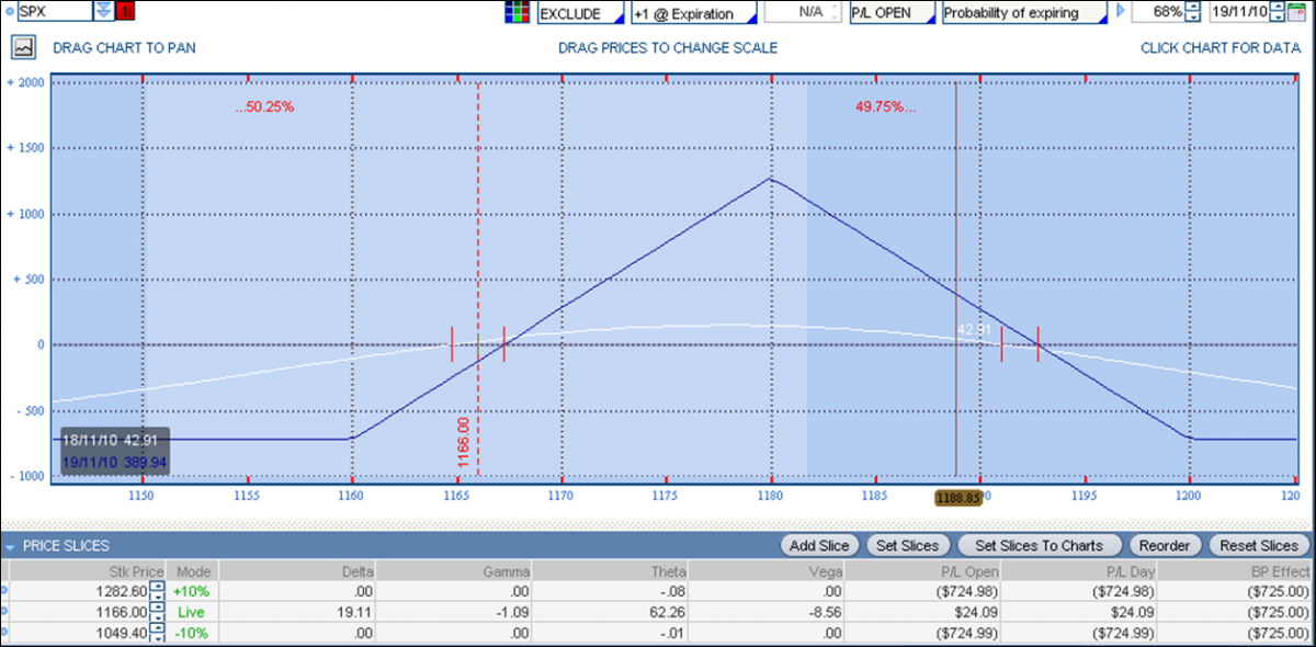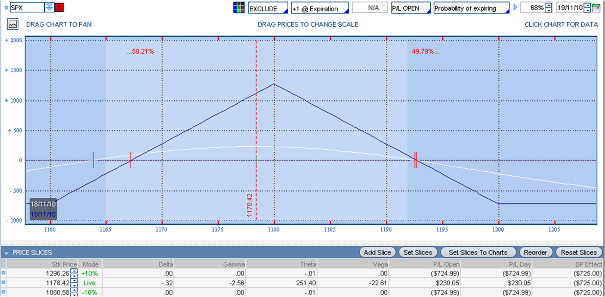 Pero no es la única forma de trabajar las butterflies. La que he comentado sería una de las formas más agresivas y de corta duración. También podemos utilizarlas con un perfil mucho más tranquilo, a unos 20 días de expiración y buscando el beneficio mediante el paso del tiempo. En este caso, saber ajustar las posiciones es fundamental (ver Income Trading).
