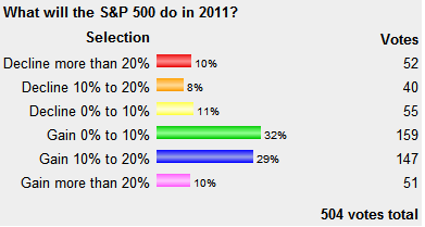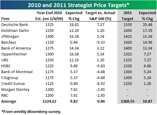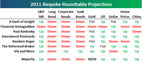 También tenemos el Roundtable de Bespoke, donde varios blogeros dan sus pronósticos para el 2011 en diferentes mercados. Podemos ver que el promedio es el siguiente: