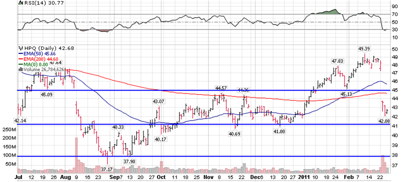 Para esta semana destacamos Hewlett-Packard (HPQ). Después de un mal dato de earnings, donde las expectativas de ventas no gustaron a los inversores, el precio de la acción caí casi un 12%.