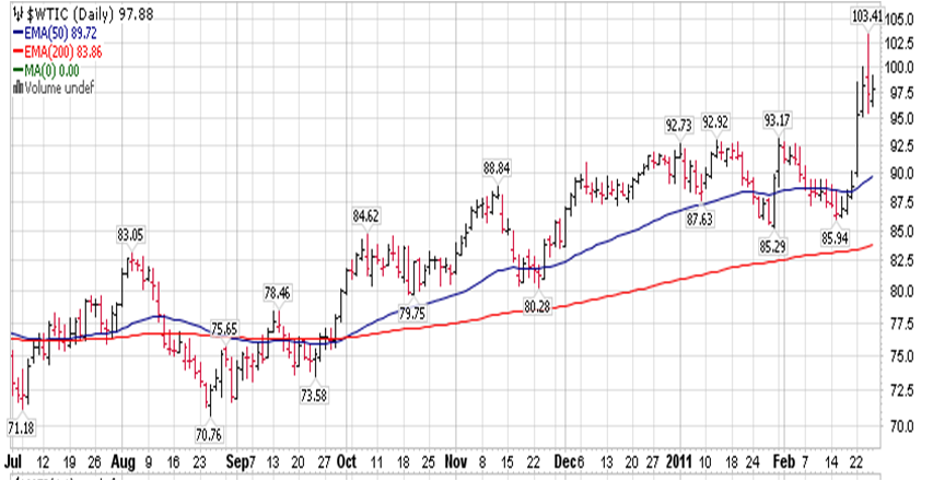 1. Incremento del precio del petróleo debido a los disturbios en Libia, llevando el crudo ligero hasta los $100