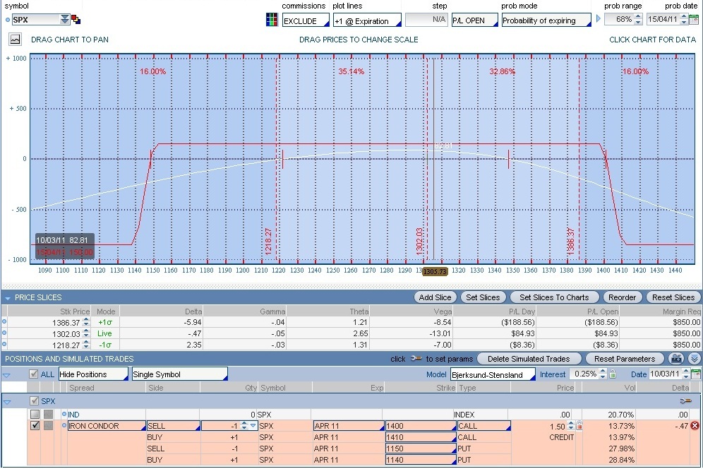 El pasado día 24 de Febrero abrí una posición sobre el SPX usando la clásica Iron Condor con strikes 1140-1150-1400-1410 y vencimiento Abril. El crédito al final fue de 150$ y el margen requerido de 850$ por contrato.
