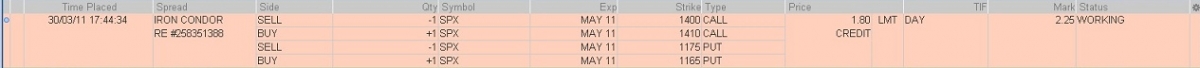 Iron Condor SPX con strikes en 1165-1175-1400-1410 por un crédito de 175$ por contrato y un margen requerido de 825$ por contrato.