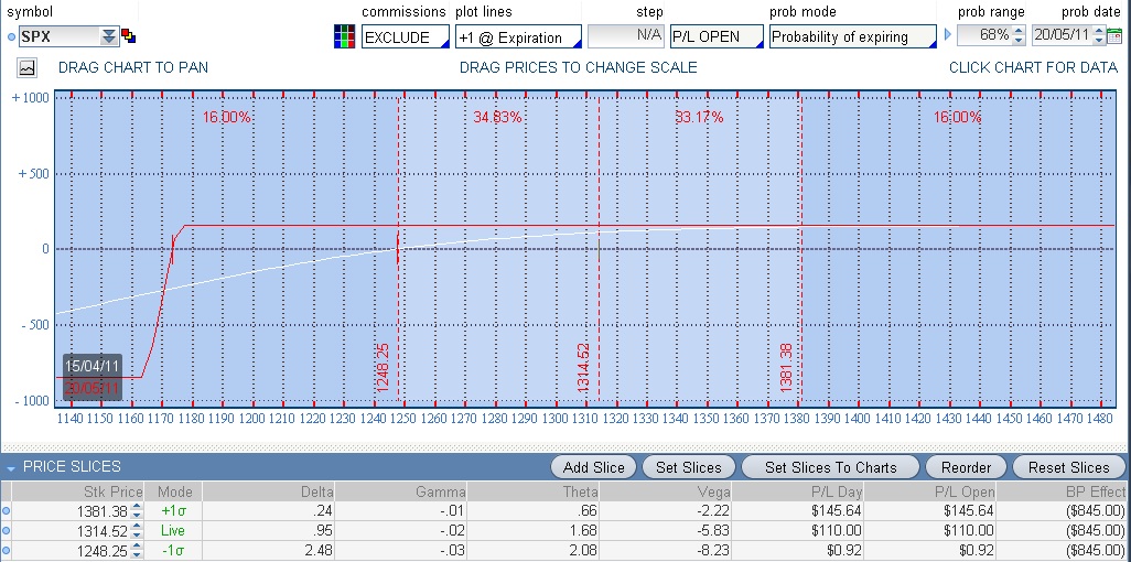 Hoy con el mercado cerrado el SPX está en 1314.52 y la volatilidad en 16.27. Luego la volatilidad ha seguido cayendo y el precio no se ha movido mucho, lo cual favorece a mi posición. Recuerda además que es una operación a la que favorece el paso del tiempo.