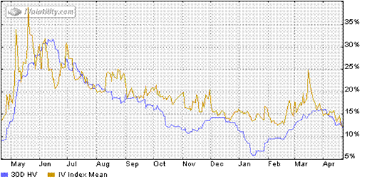 A nivel de volatilidad, el VIX cayó a los 14.69. En el siguiente gráfico vemos la relación IV/HV, lo que nos confirma el entorno de volatilidad bajo en el que estamos: