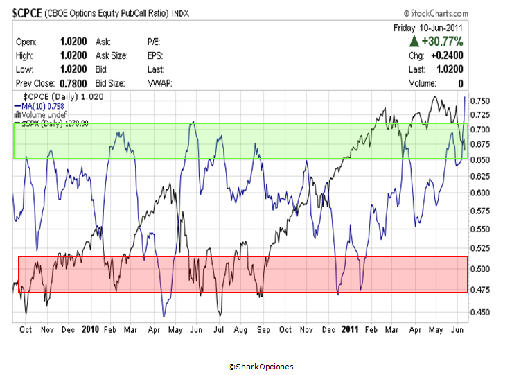 El sentimiento actual es muy bajista. El porcentaje de compradores ha caído al 56.6% y el ratio Put/Call está en niveles extremos (el viernes cerraba en 1.02):