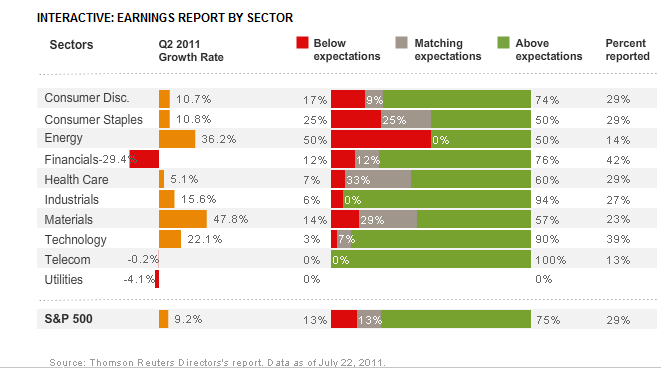 1. Temporada de Earnings: todavía han reportado aproximadamente el 30% de empresas del S&P500, pero la tendencia comienza a ser claramente positiva. El 70% de las compañías están batiendo expectativas, tanto el "top como el bottom line". En la siguiente imagen podemos ver gráficamente la evolución por sectores.