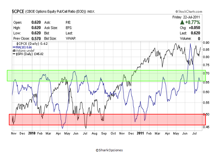 4. Situación pesimista de los inversores: el ratio put/call está marcando zona de miedo, lo que en un síntoma contrario alcista.