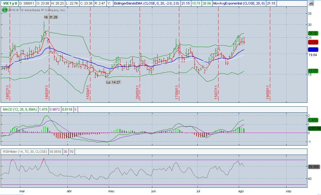 Los índices no paran de caer (8 días seguidos). Los medios ya hablan de la rotura H-C-H (ver link). Sin embargo, el indicador "amarrategui", más conocido como VIX, parece que va a otra cosa... Con menos lo hemos visto en $30 y $40.