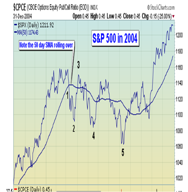En el corto plazo, el escenario que barajo es continuación de alta volatilidad y un mercado lateral, similar a lo que vimos en el 2004 (ver imagen). Creo que ahora mismo estaríamos en el último coletazo del mercado (hacia el nº 5). La incógnita es saber si veremos nuevos míimos o no.