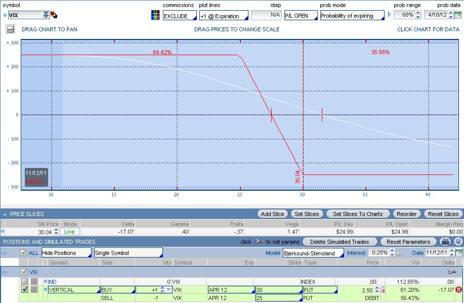Centrándome en el post, decía que era una novedad ya que la posición o estrategia de este post ni es una Iron Condor ni es sobre el SPX. ¡¡¡Hay vida más alla de las Iron Condors!!! En concreto es una posición sobre el VIX y una vertical de débito con puts luego espero una bajada de la volatilidad.