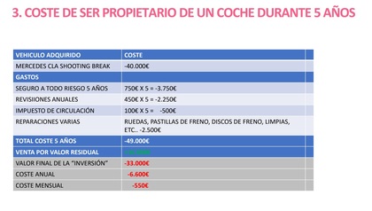 Vaya, que podríamos decir que la inversión neta real por tener ese coche fue de 33.000€ en cinco años, lo que equivale a unos 550 € al mes.