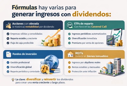Existe diferentes fórmulas para maximizar el cobro mensual de dividendos; desde acciones con una elevada rentabilidad por dividendo, ETFs covered call con una rentabilidad objetivo del 10%, hasta fondos o REITs. Descubre a partir de que punto esta estrategia tiene sentido