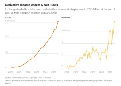 Tal ha sido la fiebre por esta clase de instrumentos, que la captación de fondos por parte de esta categoría de ETFs en los últimos años ha sido explosiva, pasando de s acumular 7.000 millones de dólares (enero 2020), a 150.000 millones (mediados de 2025). El éxito de los ETFs Covered Call en dos gráficos