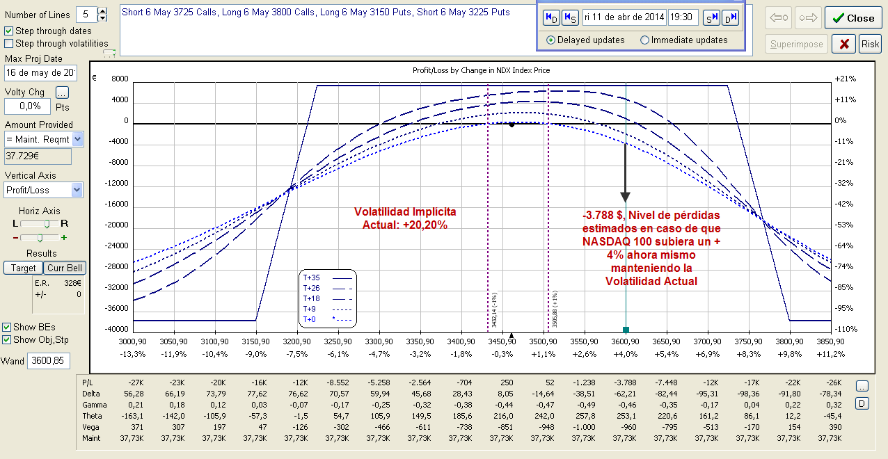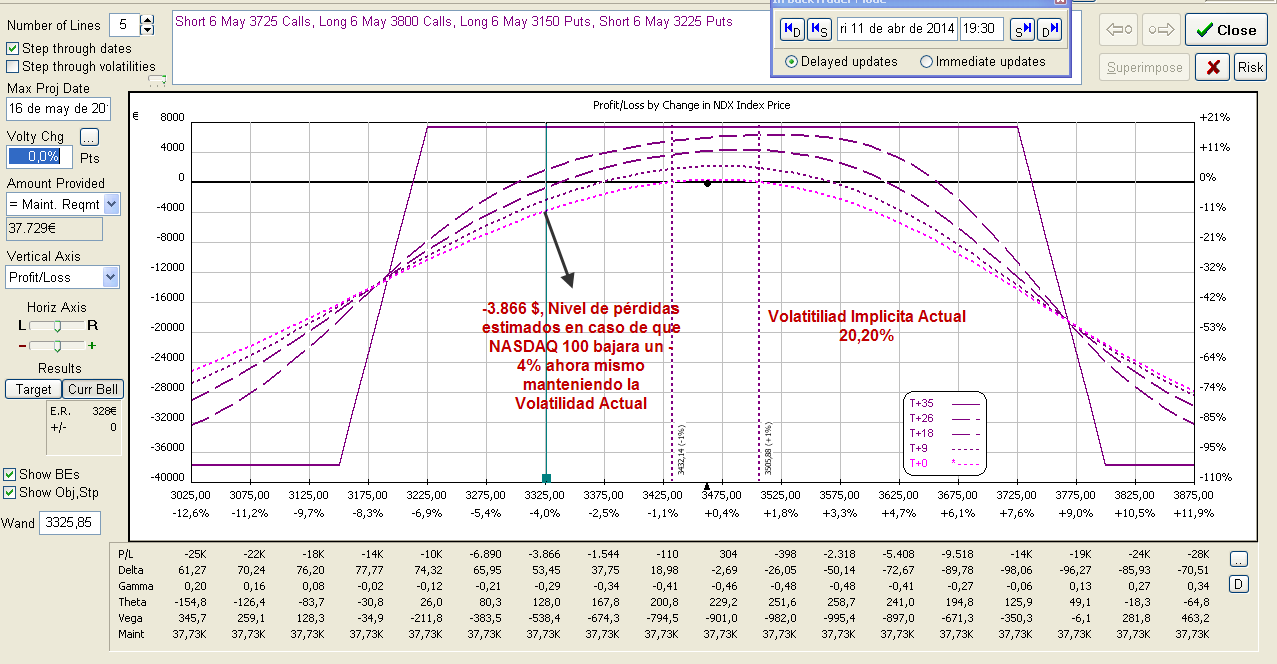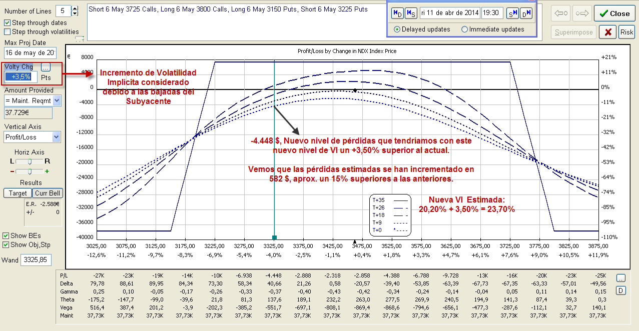 Sabemos que una de las variables que sabemos más nos afectará durante la vida de la posición será la Volatilidad Implicita. En índices y acciones ésta suele incrementarse en caso de bajadas y reducirse en caso de subidas. Como vimos en el anterior artículo es muy fácil obtener una primera aproximación sobre cómo evolucionaría la posición en caso de que la Volatilidad Implícita se mantuviera constante. No obstante, la Volatilidad nunca será constante, y por tanto esta primera aproximación no nos resultará realmente muy util. Necesitamos acercarnos al verdadero escenario que obtendremos tanto en caso de subidas como de bajadas de nuestro subyacente y por tanto de la Volatilidad Implícita. Nuestro plan de trading y ajustes a realizar dependerán entre otras cosas de este importante aspecto ¿cómo afrontar esto mediante nuestro software? ¿cómo podemos acercarnos al valor y resultado que arrojarían nuestras posiciones ante oscilaciones de la VI?