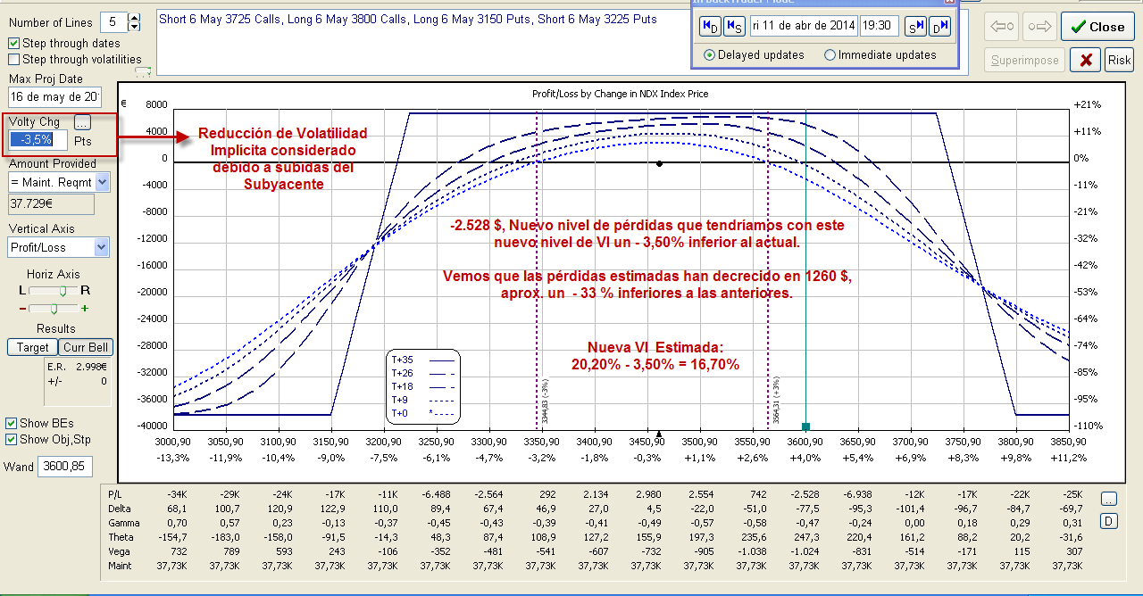 Vemos que los resultados que obtendríamos ante un movimiento de un 4% pero en sentido ascendente han mejorado notablmente. Ya no nos enfrentariamos a unas pérdidas de -3.788 $ sino a mucho menos, -2.528 $. Esto sin duda afectará a nuestro plan de trading y riesgos iniciales. Resulta en definitiva que donde pensábamos habia un gran riesgo resulta ahora que con bastante probabilidad tal riesgo no será ni mucho menos tan elevado.