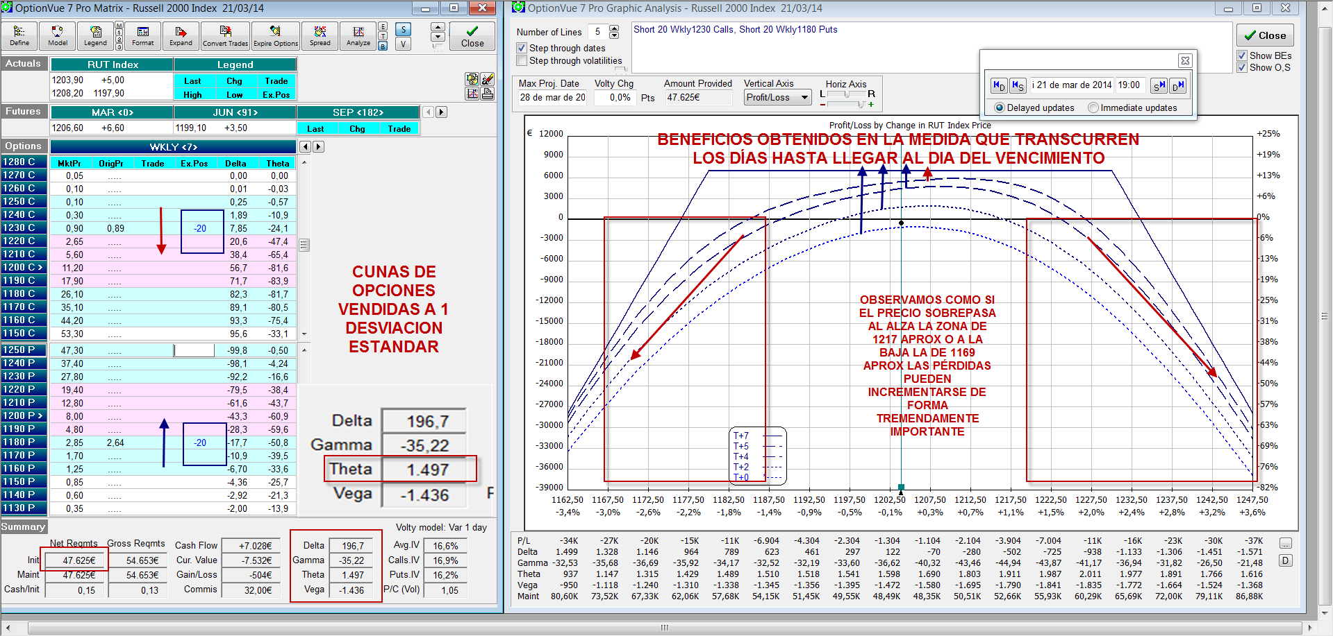 Vemos que el pasado 21 de Marzo abríamos 20 Cunas Vendidas a una distancia de una desviación estándar del precio de nuestro subyacente en ese momento, Russell 2000, que en era de 1203,90 ptos. Nos ingresan por ello unas primas de 7.029 $, aprox. un +7% de nuestro capital en cuenta, 100.000 $.