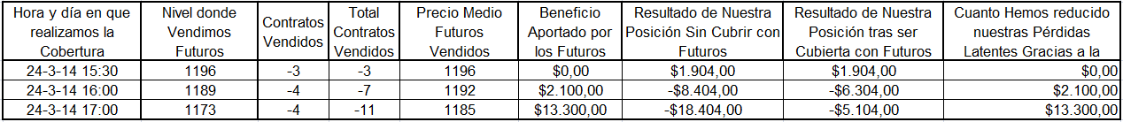 - Que el mercado continué bajando y por tanto tengamos que seguir añadiendo algún futuro más para ir conteniendo las pérdidas. Llegaría el momento de que ya nos sería muy difícil terminar la posición con beneficios ante lo que tendríamos que valorar si nos interesa seguir en ella o asumir las pérdidas latentes que tengamos que, por supuesto, van a ser siempre muchísimo menores a las que hubiéramos tenido que asumir de no haber hecho ningún tipo de cobertura.