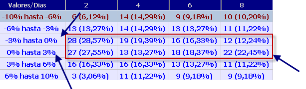 Vemos como dos dias despues de darse cada uno de los casos las probabildidades de subir entre un 0 y +3% (27,55%) son las mismas que las de bajar entre un 0 y un -3% (28,57%). Incluso hay mas tendencia a subir más de un +3% que a bajar más de un -3%.