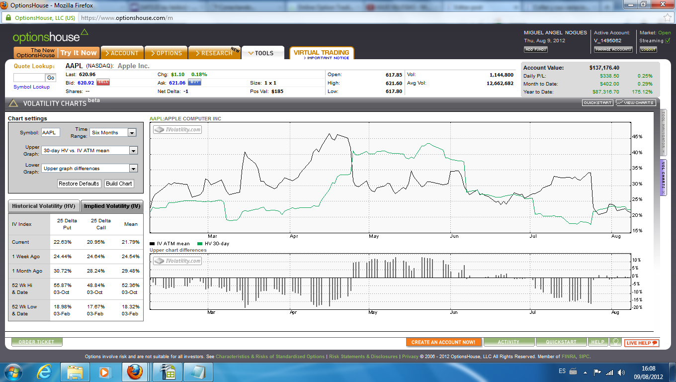 La explicación fundamental a ello, quizás habría que analizarla con el comportamiento de la volatilidad implícita de las put 600 Ene/14, que compradas el 18 de Mayo, ha ido mermando en los últimos meses. Adjunto datos de la volatilidad implícita e histórica de Apple en los últimos seis meses.