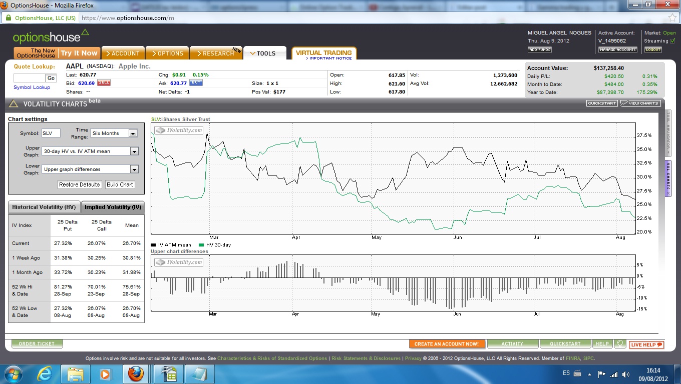 Otra posición que también tiene delta aproximadamente neutral e incluso no tuvo theta positiva todo el tiempo pues inicialmente se diseño para operaciones gamma-scalping es ésta http://www.rankia.com/blog/option-spreads/1243677-gamma-trading-scalping-slv Aquí se aperturó el 7 de Mayo con un nivel muy bajo de volatilidad implícta en SLV, luego ésta repuntó aunque ahora ha vuelto a caer y la posición prácticamente siempre ha tenido beneficios latentes. Adjunto también datos de volatilidad de SLV en los últimos tres meses.