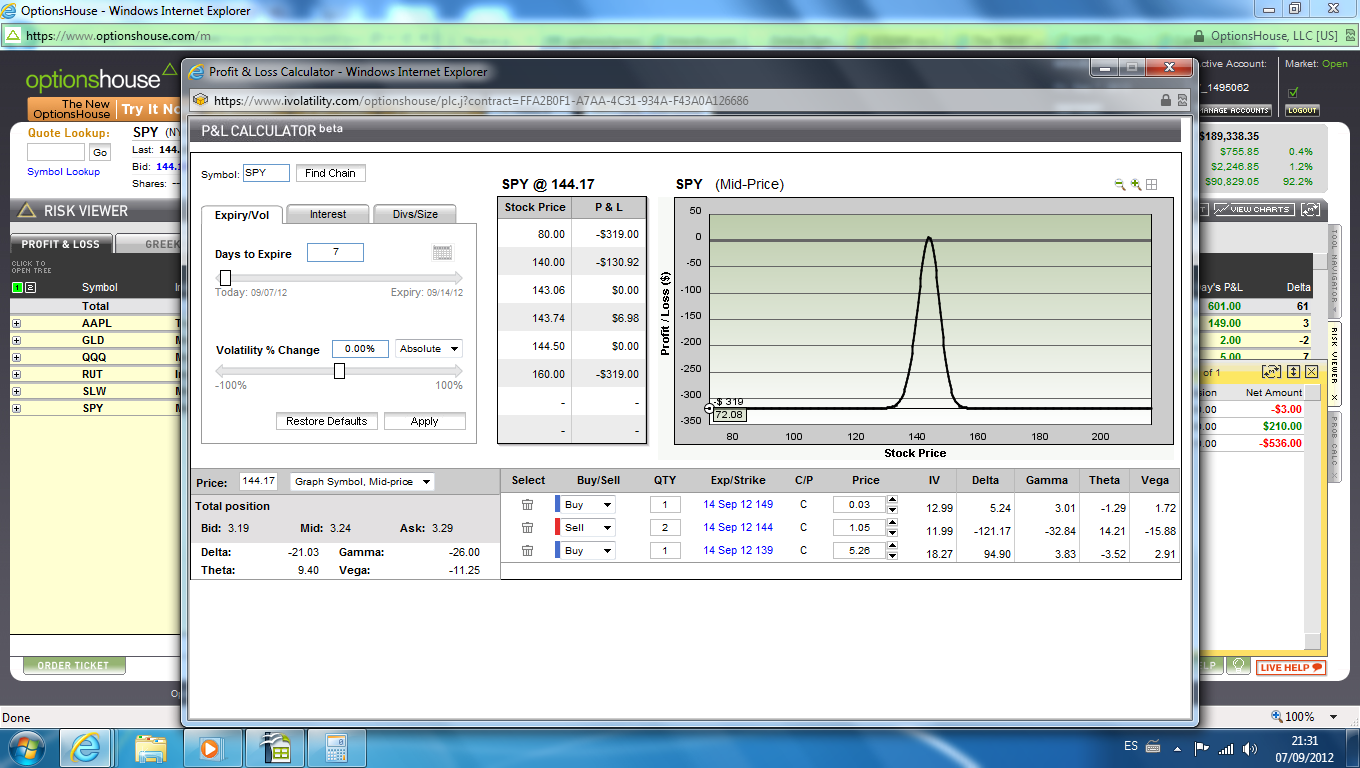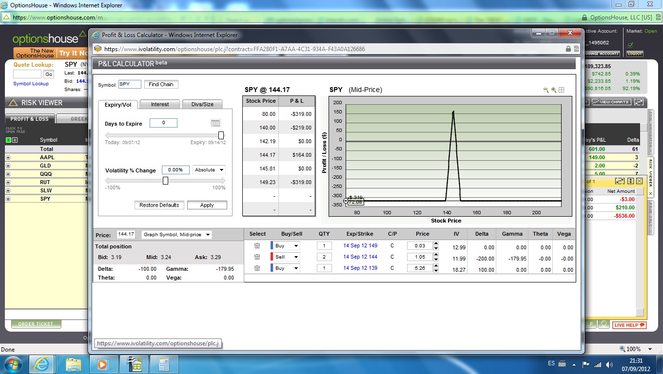Me anima a desarrollar algo similar sobre el SPY que es menos volátil. La estrategia es una mariposa comprada con las opciones vendidas a dinero y las opciones compradas en dinero y fuera de dinero. La posición se abre hoy y expira el próximo viernes.
