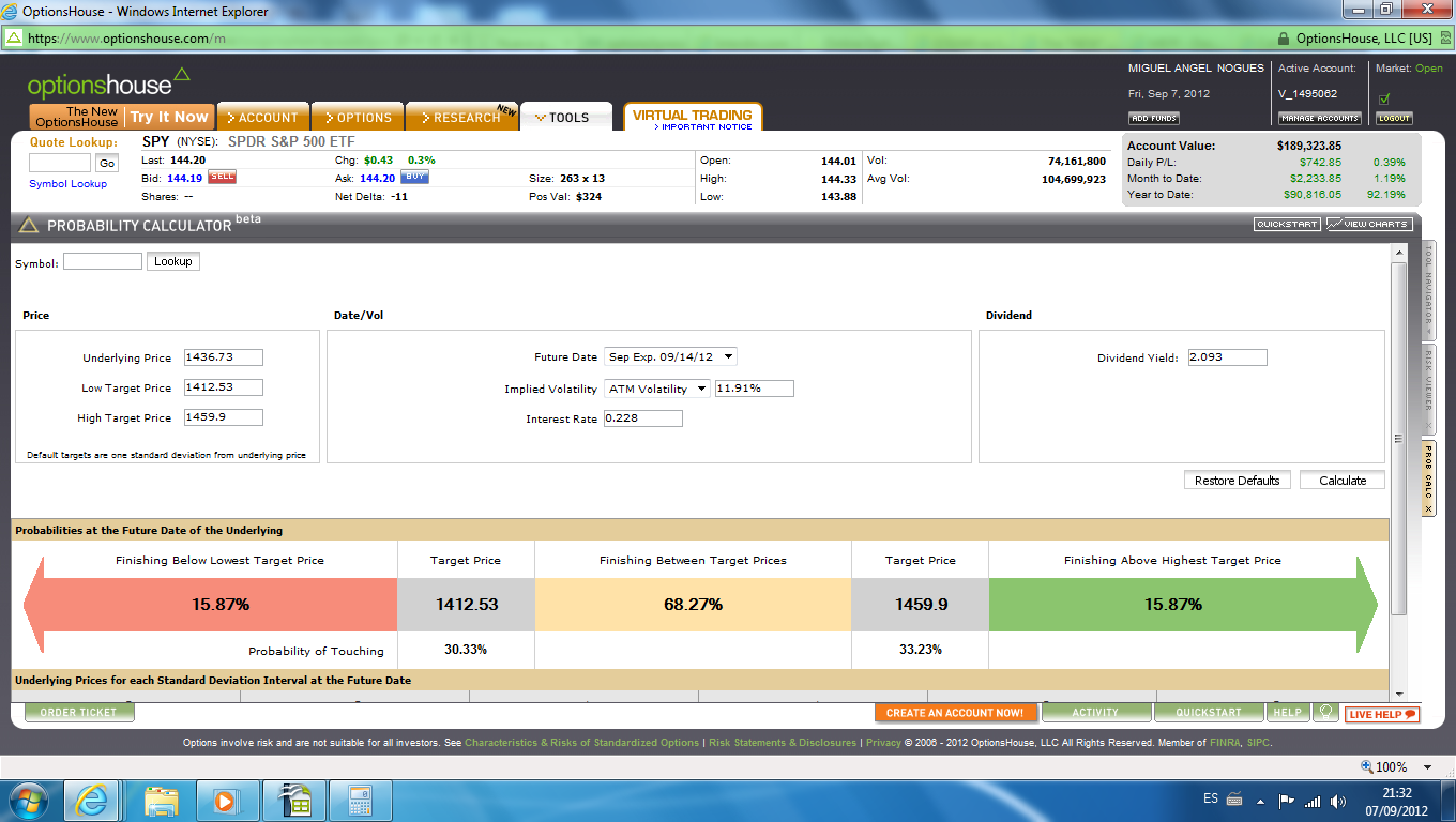 La probabilidad de que SPY quede en la zona de influencia de la mariposa es elevada, la siguiente imagen estima que con un 68,25% de probabilidad a vencimiento quedaría entre 141,25 y 145,99