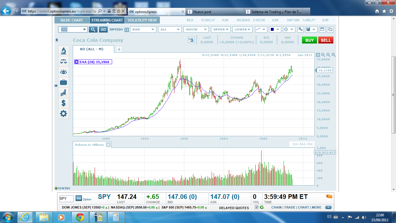 Partimos del gráfico mensual de KO y vemos una serie de precios alcista: Un periodo alcista nítido desde 1985 hasta Julio/1998, una tendencia bajista de consolidación hasta Marzo/2009 y un último periodo alcista desde Marzo/2009. Una media exponencial mensual me confirma la tendencia alcista actual.