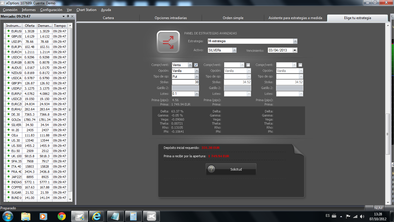 1. Vendemos una put vanilla 38 a vencimiento, ingresamos 1749,49 euros y el broker nos requiere un margen de tan solo 331,38 euros. Es lo bueno de XTB que los márgenes son mínimos y predecibles, pues este margen casi siempre es estable y apenas se incrementa ni disminuye (es un 2,5% del precio de la plata convertido a euros, en este caso 34,52 USD que cotiza la plata x 500 USD al ser 0,1 lote * 2,5% y convertido todo a euros).