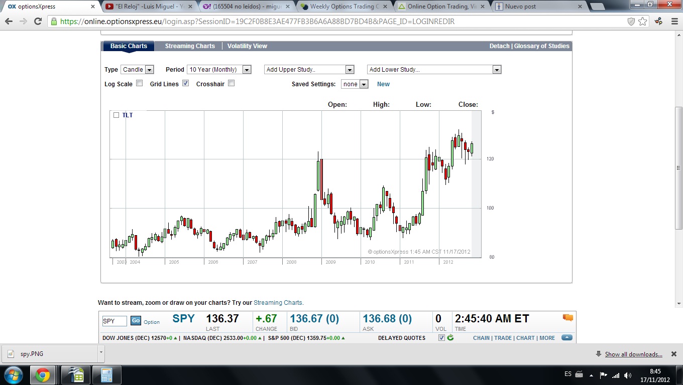 Adjunto gráficos mensuales de diez años de tres subyacentes: SPY, RUT y TLT. Sobre los dos primeros se aplican frecuentemente iron-condor, renunciando a la mayor volatilidad e imprevisibilidad ante determinados eventos que puedan presentar las acciones. Pero es que otros subyacentes como puedan ser los referenciados a renta fija, por ejemplo TLT y los referenciados también a divisas, presentan aún mayor estabilidad que aquéllos que tienen como subyacente índices de renta variable.