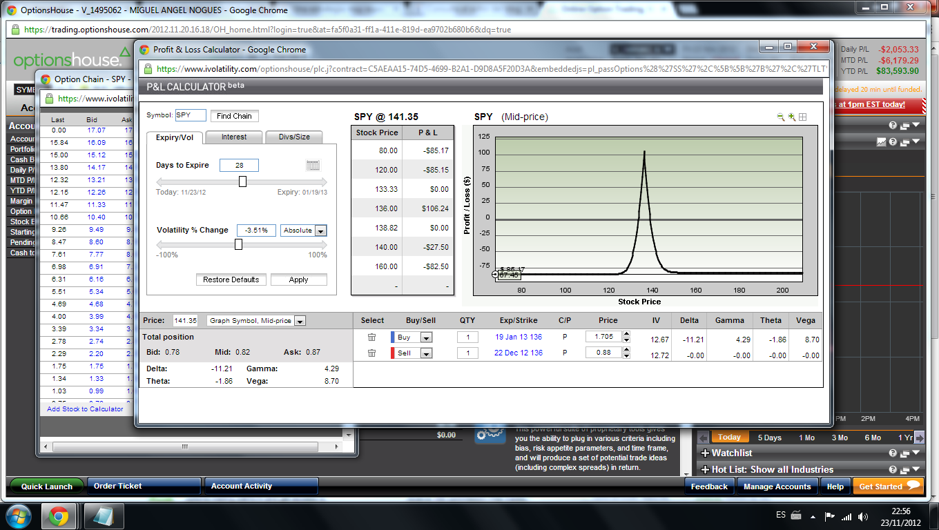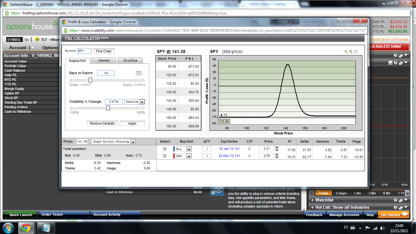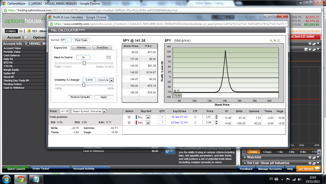 Como una imagen vale más que mil palabras adjunto una simulación de call calendar 146 s/SPY y  un put calendar 136 s/SPY  (o sea un calendar horizontal fuera de dinero y otro calendar horizontal a dinero).