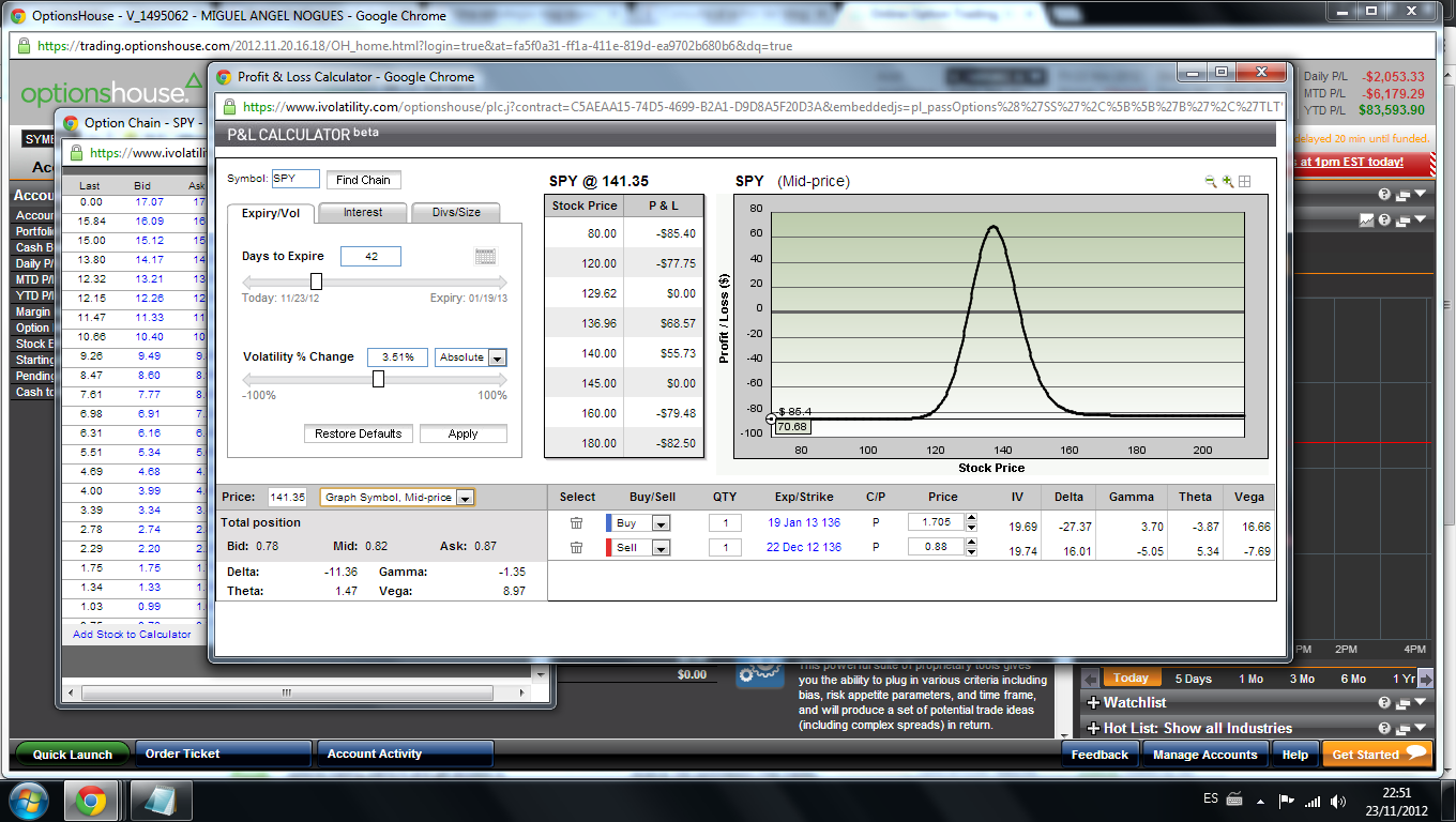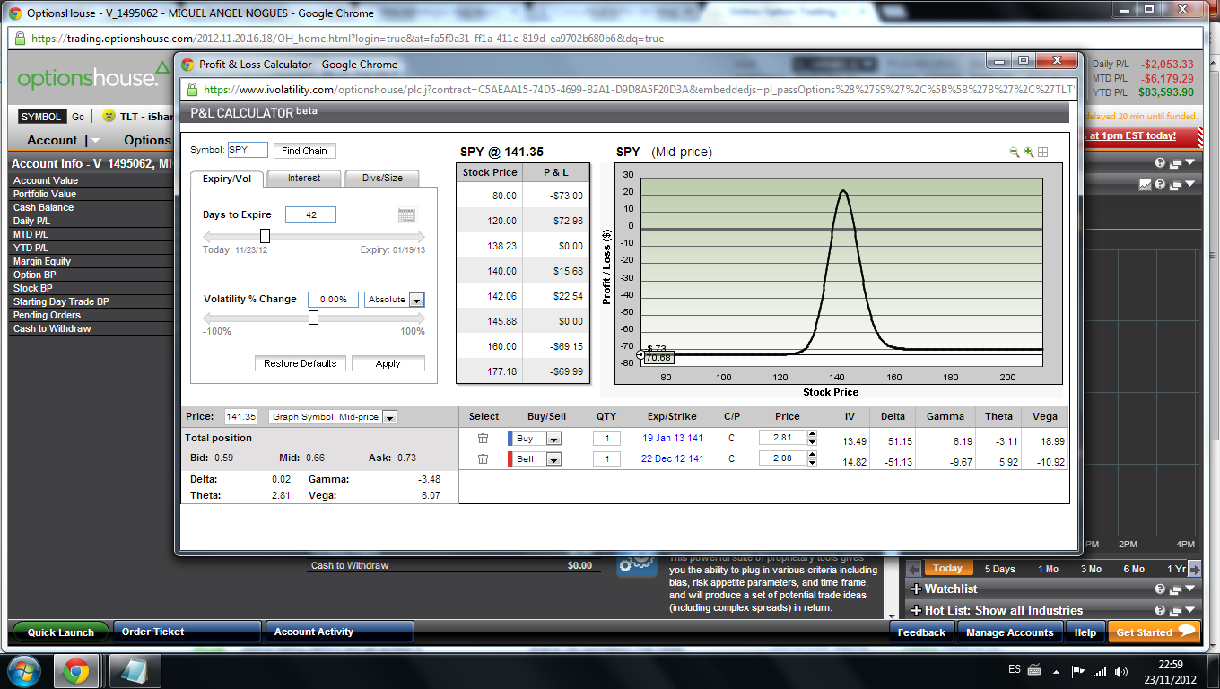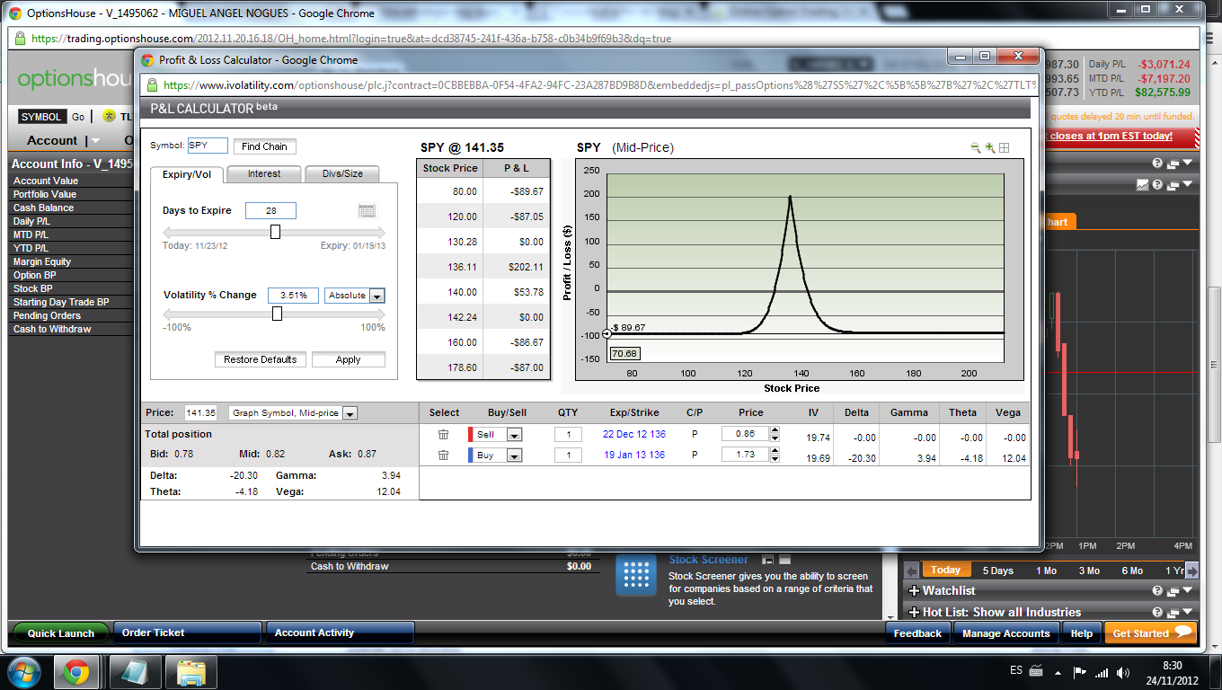 Como una imagen vale más que mil palabras adjunto una simulación de call calendar 146 s/SPY y  un put calendar 136 s/SPY  (o sea un calendar horizontal fuera de dinero y otro calendar horizontal a dinero).