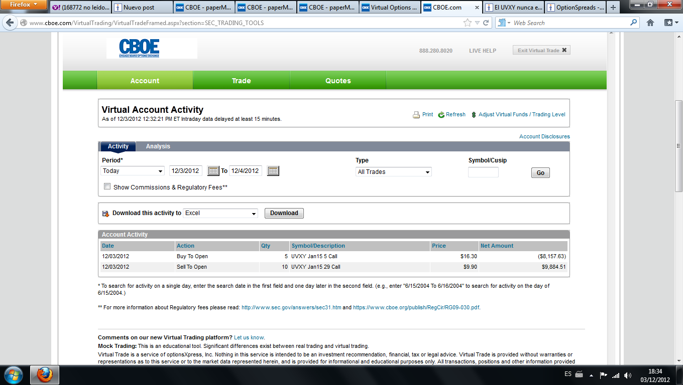 Gracias a CBOE puedo acceder a una nueva cuenta demo y vuelvo a operar un nuevo call ratio spread, que detallo a continuación: