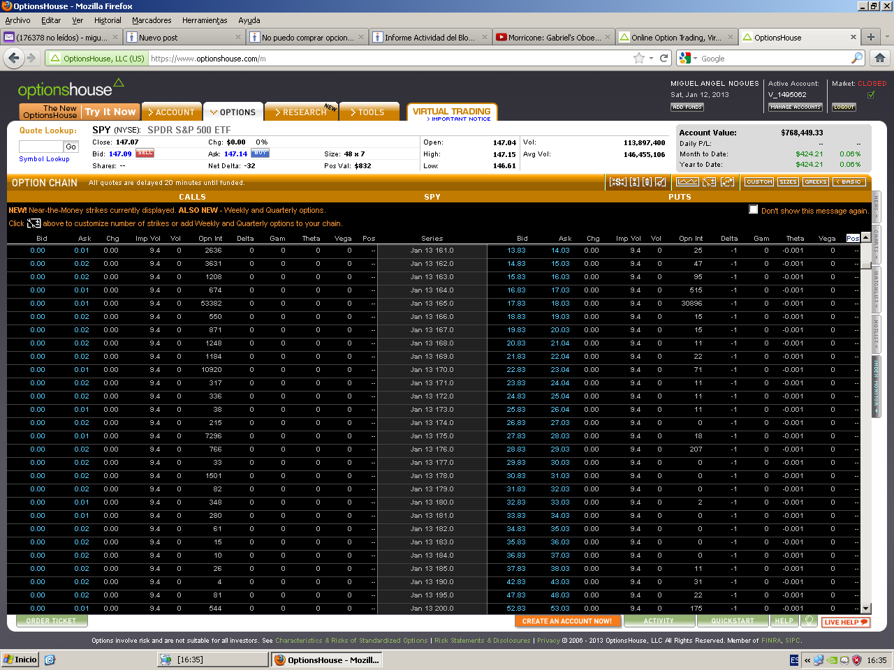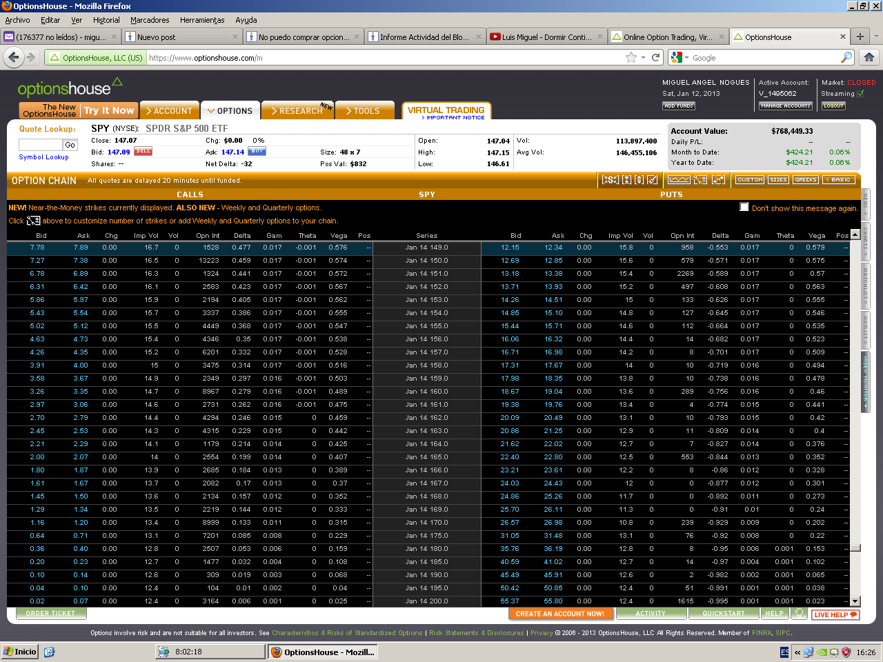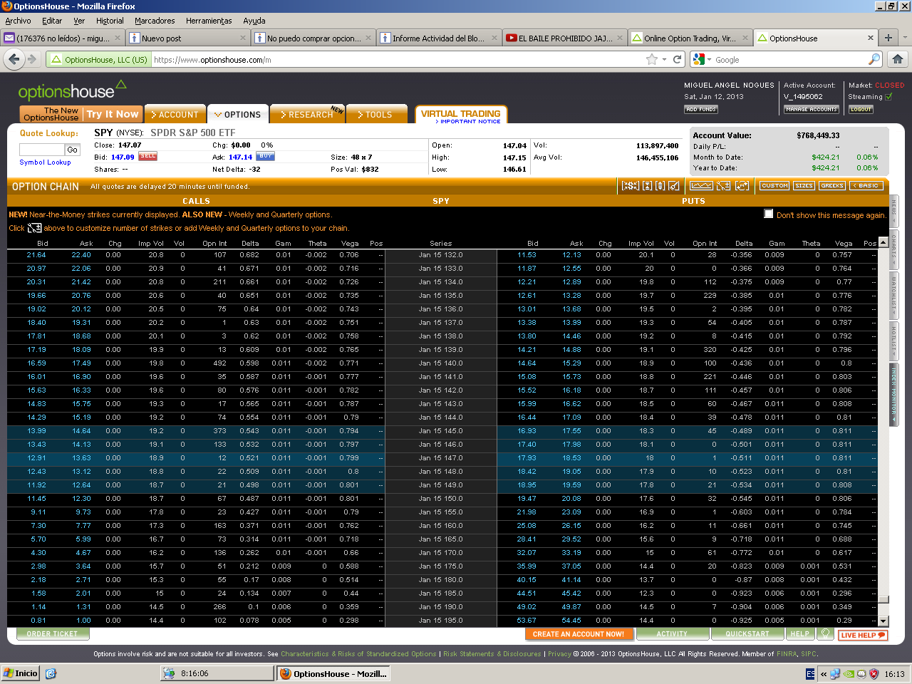 Si ahora queremos saber como será la probable evolución de este volatility smile a lo largo del tiempo, podemos ir a ver el volatility smile de estos mismos strikes en los vencimientos de Ene/14 y Ene/13 y observaremos que lo que va probablemente a ocurrir si los niveles de volatilidades y precio en el SPY permanecen similares es que tanto call como put, tanto strikes fuera de dinero, como a dinero, como dentro de dinero van a ver reducida su volatilidad implícita. Así en las call 132 Ene/14, en las call 147 Ene/14 y en las call 195 Ene/14 la columna Imp Vol muestra respectivamente los siguientes valores: 20,1% - 17,1% -12,4%. Si nos vamos a ver los valores de las put para las put 132 Ene/14, put 147 Ene/14 y put 195 Ene/14 vemos respectivamente estos otros valores: 19,2% - 16,2% - 12,4%. Adjunto imágenes de estas series de opciones: