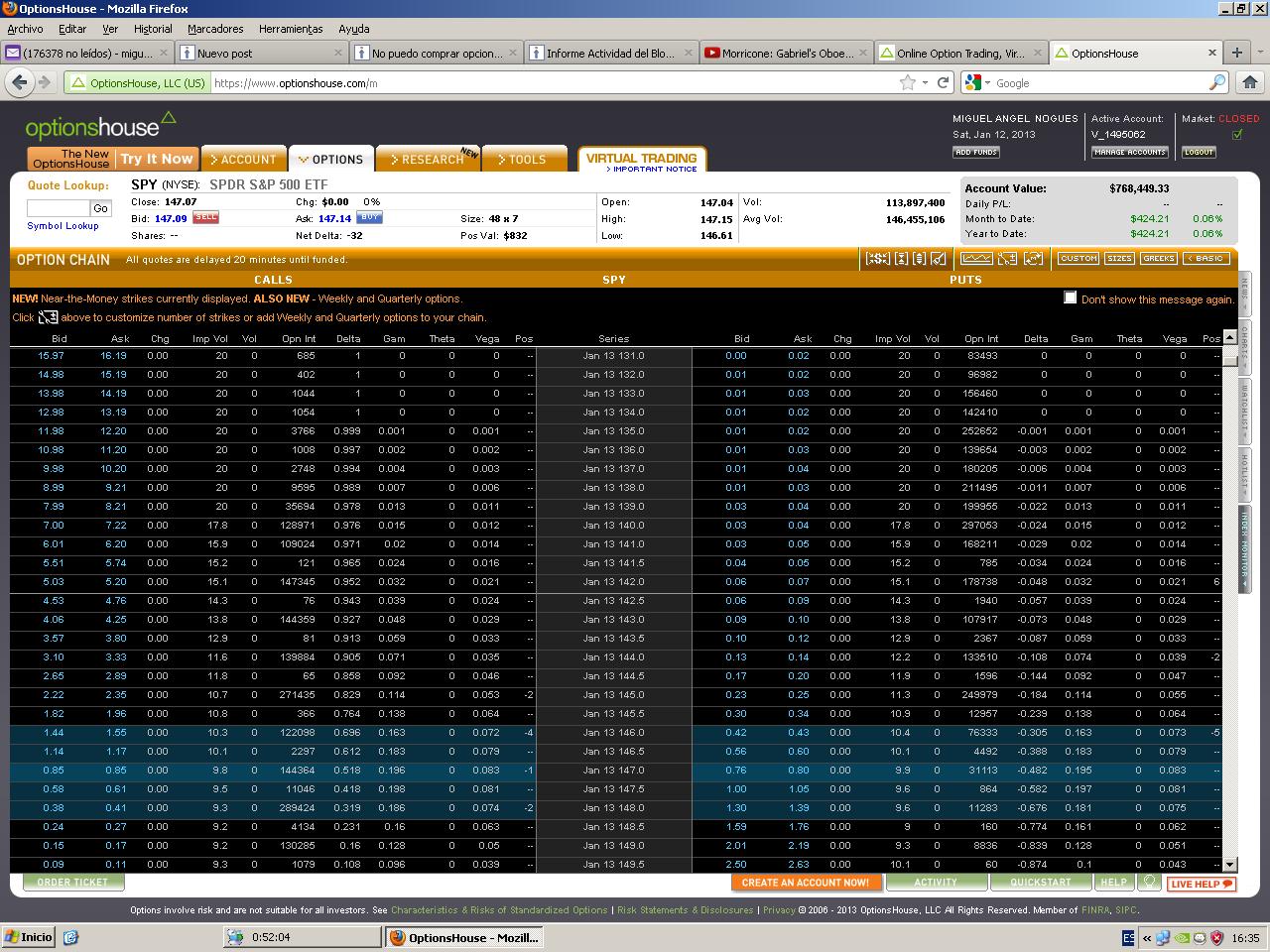 Finalmente observamos que los mismos strikes en vencimiento Ene/13 ven reducirse aún más su volatilidad implícita. Así en las call 132 Ene/13, en las call 147 Ene/13 y en las call 195 Ene/13 la columna Imp Vol muestra respectivamente los siguientes valores: 20% - 9,8% - 9,4%. Si nos vamos a ver los valores de las put para las put 132 Ene/13, put 147 Ene/13 y put 195 Ene/13 vemos respectivamente estos otros valores: 20% - 9,9% - 9,4%. Todas vuelven a caer de valor excepto la put fuera de dinero, que aumenta ligeramente su nivel. Adjunto imágenes de estas series de opciones: