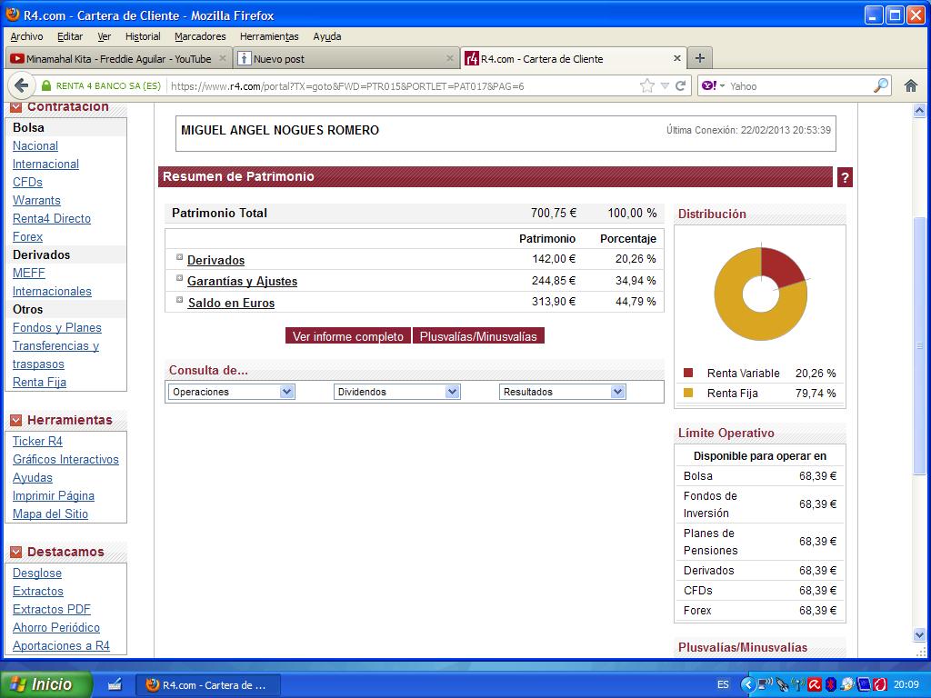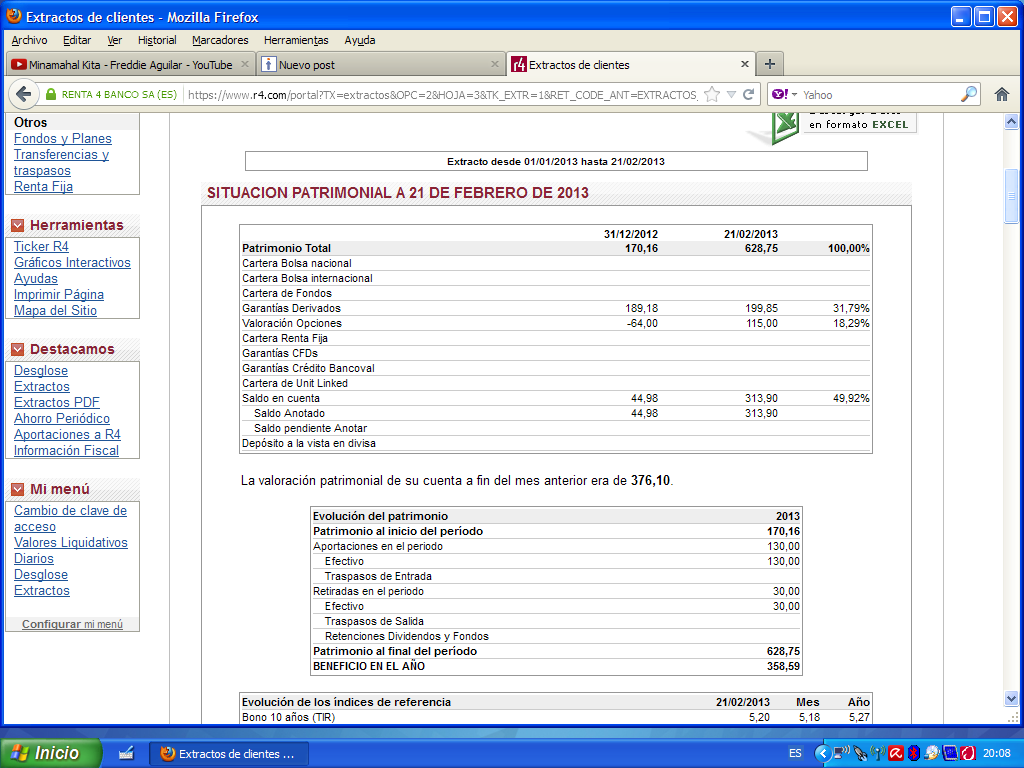 Bien, y haciendo experimentos en los dos últimos meses con opciones Meff mini-ibex, muestro una imagen de una pequeña cuenta con dinero real en Renta4 que se revaloriza en un porcentaje amplio. Partimos de 170,16 euros a comienzos de año, reintegro 30 euros e ingreso posteriormente 130 euros. A fecha 21/02/13 el valor de la cuenta entre dinero y posiciones abiertas es de 628,75 euros con una ganancia de 358,59 euros; al final de este periodo apenas suben las garantías desde 189,18 euros hasta 199,85 euros.