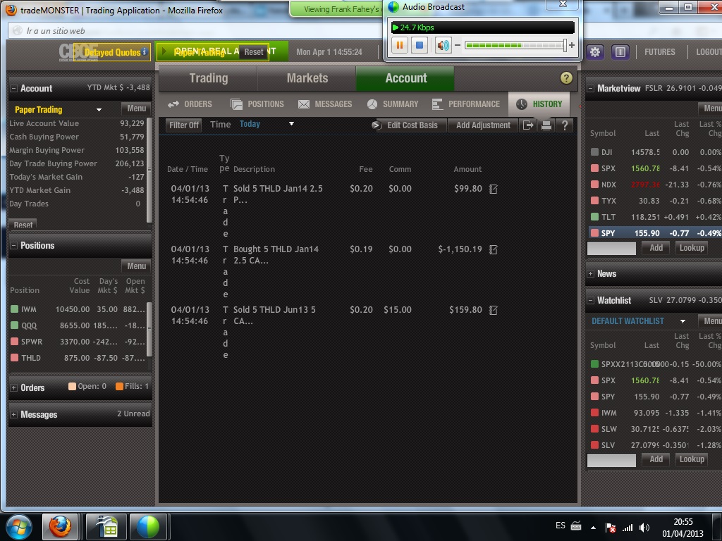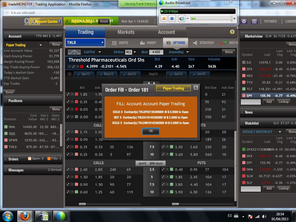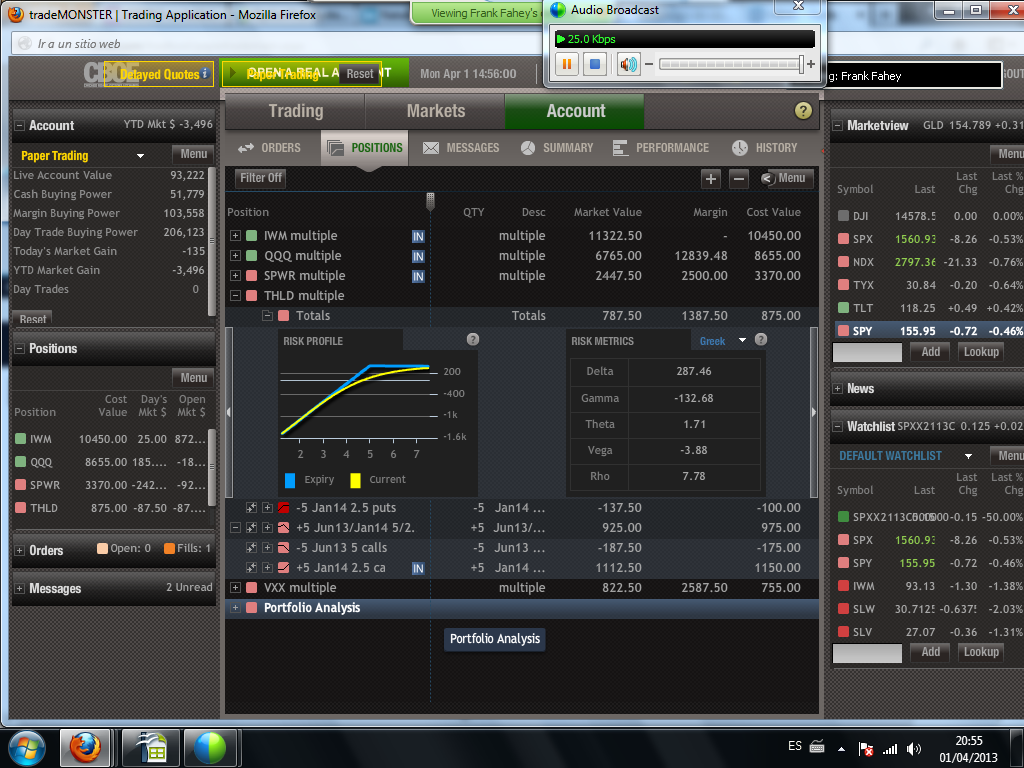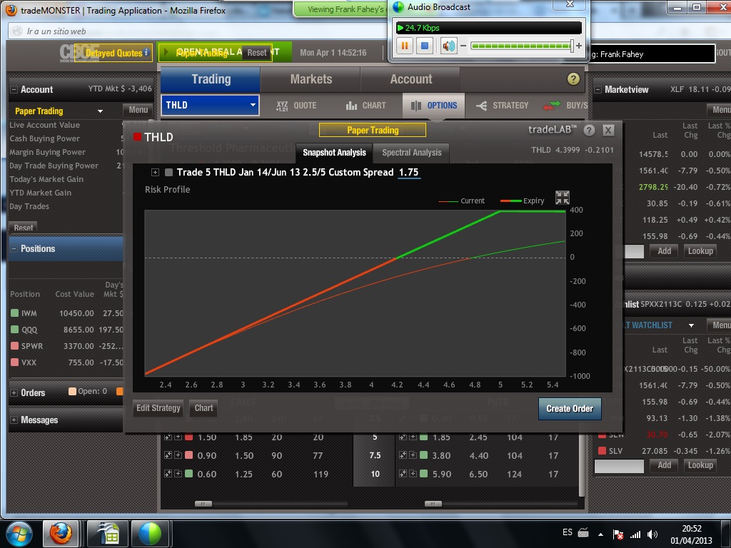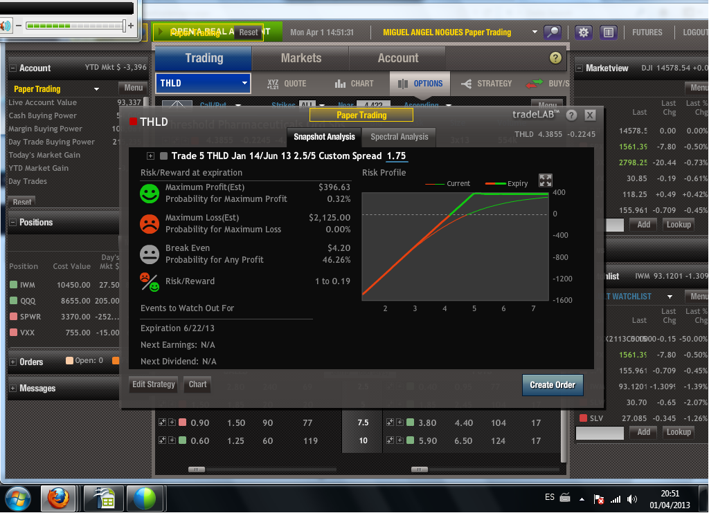 En vista, no obstante a las experiencias no muy consistentes hasta ahora, en FSLR Spread Alcista en FSLR y SPWR Spread Alcista en SPWR voy a ser conservador, así que el spread consistirá en la compra de un call diagonal spread en dinero las opciones compradas y a dinero las opciones vendidas más la venta de unas put fuera de dinero con volumen el mismo que el ratio del call spread.