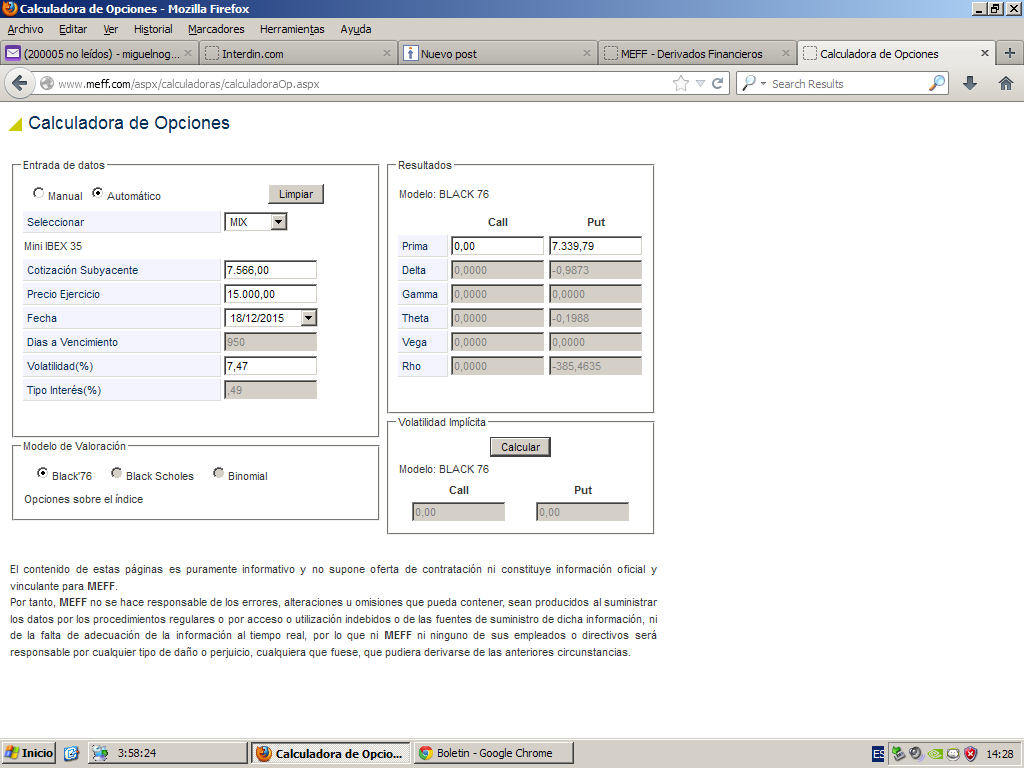 Muestro igualmente la imagen de la calculadora de opciones de Meff con teóricos y griegas de ambas series, así como la calculadora de garantías exigidas para esta posición según Meff.