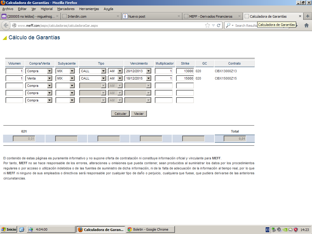 Queda una posición residual que muestro en la imagen de arriba que intentarán cerrar el lunes. Me temo que lo van a tener complicado porque son strikes tan alejados del dinero que no es que halla precios absurdos, sino es que sencillamente no suele cotizar ya precio alguno en las últimas sesiones. Igualmente dudo mucho de que Meff facilite horquilla de precios alguna en esas series si se le pidiera. Los teóricos de ambas series call 15000 Dic/15 y call 13000 Dic/13 son cero, las garantías de la posición son 0,01 euros según Meff y son series sin delta, vega, rho, theta ni gamma. No se debiera pagar prima neta por deshacer la posición, simplemente comprar la call 15000 Dic/15 a 1 y vender la call 13000 Dic/13 a 1. Si ellos no pueden o no quieren ser contrapartida, puedo pasar la posición a estos precios a mi cuenta de Renta4 el martes a la apertura del modo anteriormente descrito usando precios de 1 que es lo más que se debiera contemplar.