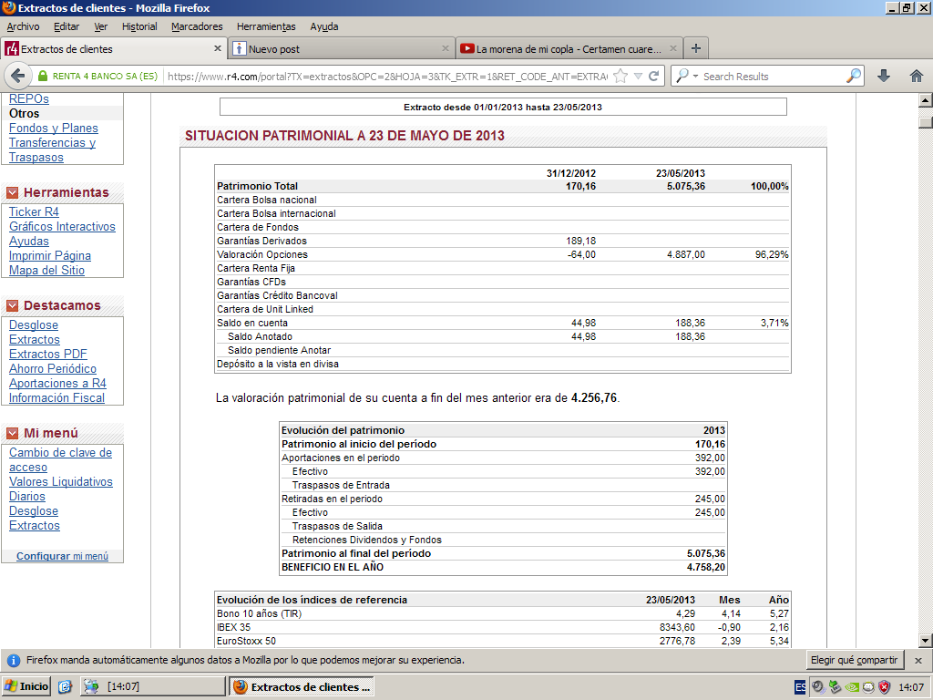 El valor patrimonial de la cuenta, por otro lado, ha seguido incrementándose ligeramente hasta 5075,36 euros una vez descontadas comisiones. Como se ve en la imagen adjunta hubo de hacerse alguna pequeña aportación monetaria, aparte de intentar reducir el margen, para que Renta4 mantuviera la posición. Es lo bueno de este broker, que mientras reduzcas y aportes dinero, no te cierra y menos se le ocurre cerrar a cualquier precio, si el valor patrimonial de la cuenta es también positivo. Con Interdín a estas alturas habría pérdidas efectivas de más de 20000 euros. En fin no voy a dar más vueltas al tema de Interdín, cada cuál sepa con quien trabaja. Como contrapartida Renta4 se habrá ingresado fácilmente más de 1000 euros por comisiones en el último mes, pues la operativa ha sido ciertamente complicada y laboriosa. Lo cuál es correcto porque para que un negocio funcione, ambas partes tienen que ganar.