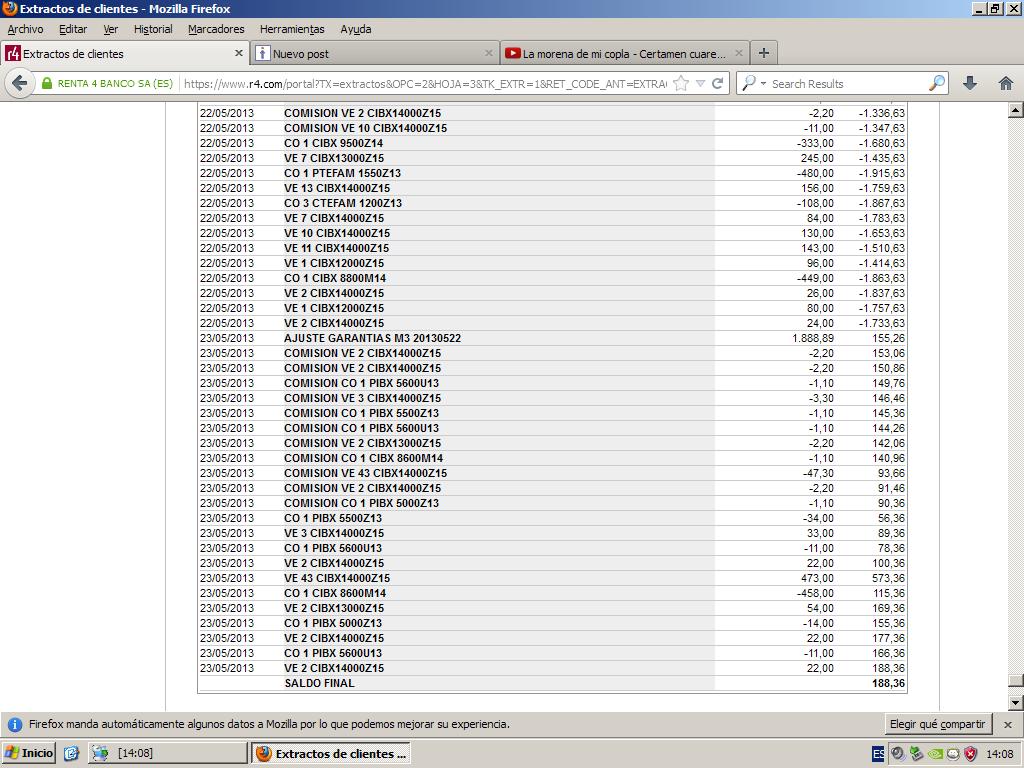La segunda imagen es la última página del extracto donde figura la operativa del pasado día 23 de Mayo y se aprecia que tras abonar los 1888,89 euros de garantías de la anterior sesión, Meff ya no carga margen alguno.
