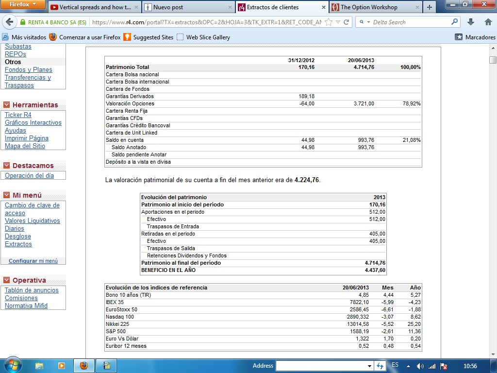 Continuando con el seguimiento a mi posición real en opciones Meff s/futuros de mini-ibex, adjunto el resumen de la cuenta a fecha 20 de Junio.