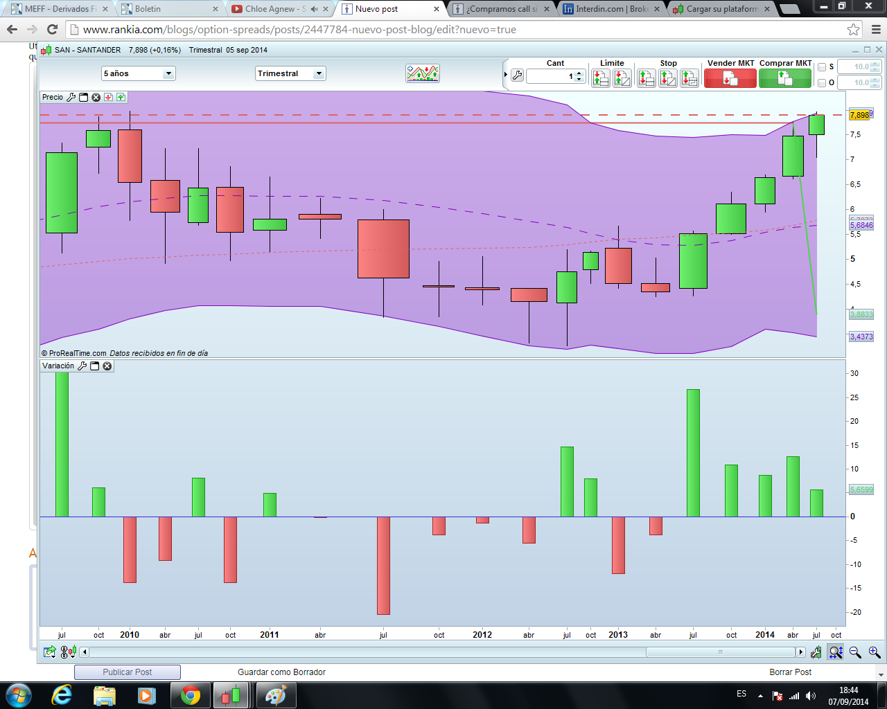 Y a continuación y aunque no sea muy representativo por problemas de liquidez observamos lo que cuesta comprar un straddle de SAN con tres meses a vencimiento y un straddle de SAN con doce meses a vencimiento. La compra de un straddle en strike 8 y vencimiento Dic/13 cuesta 0,76 y la compra de un straddle en strike 8 y vencimiento Set/15 1,55