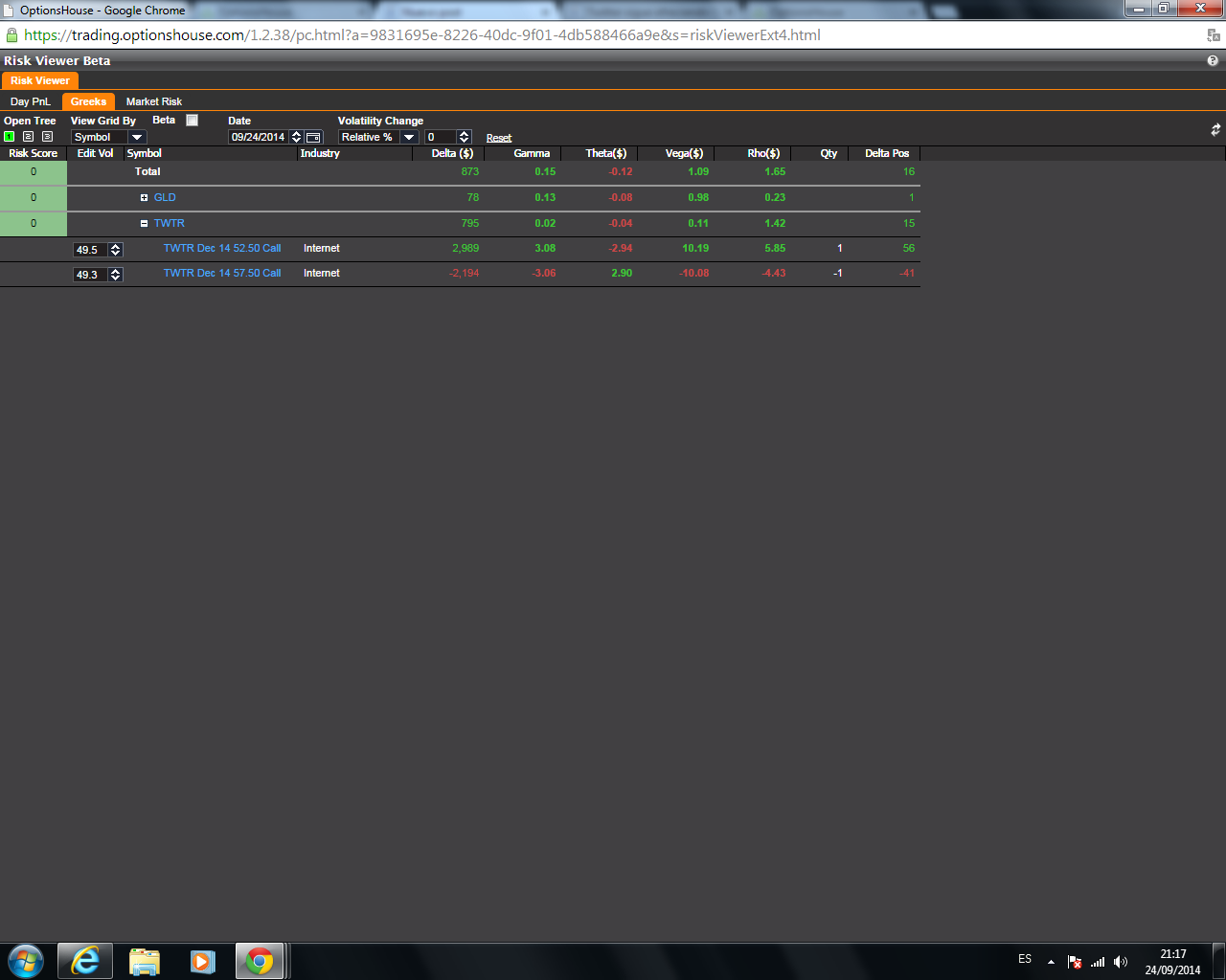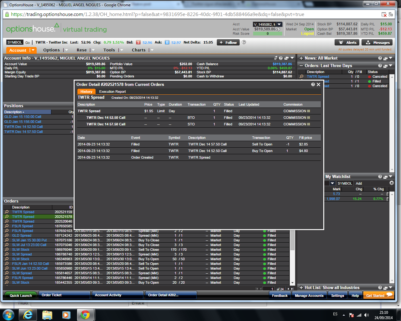 He rescatado una antigua cuenta demo que conservo en OptionsHouse (que tomen nota muchos brokers españoles que las cuentas demo se dan por tiempo ilimitado) y he abierto esta hipotética posición.