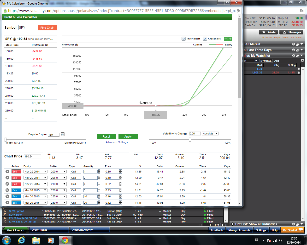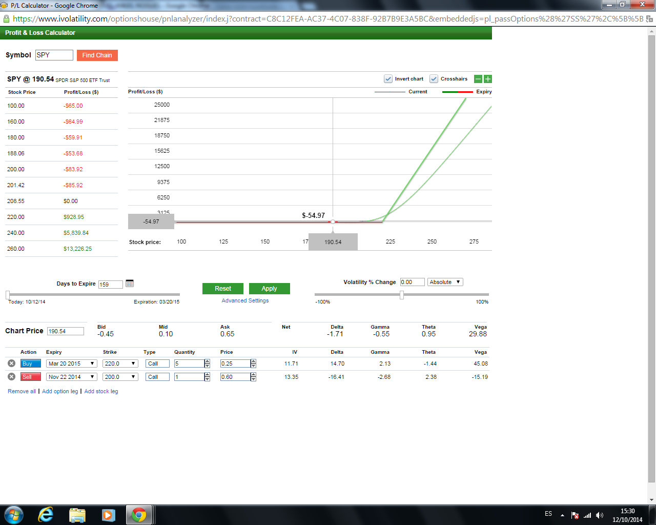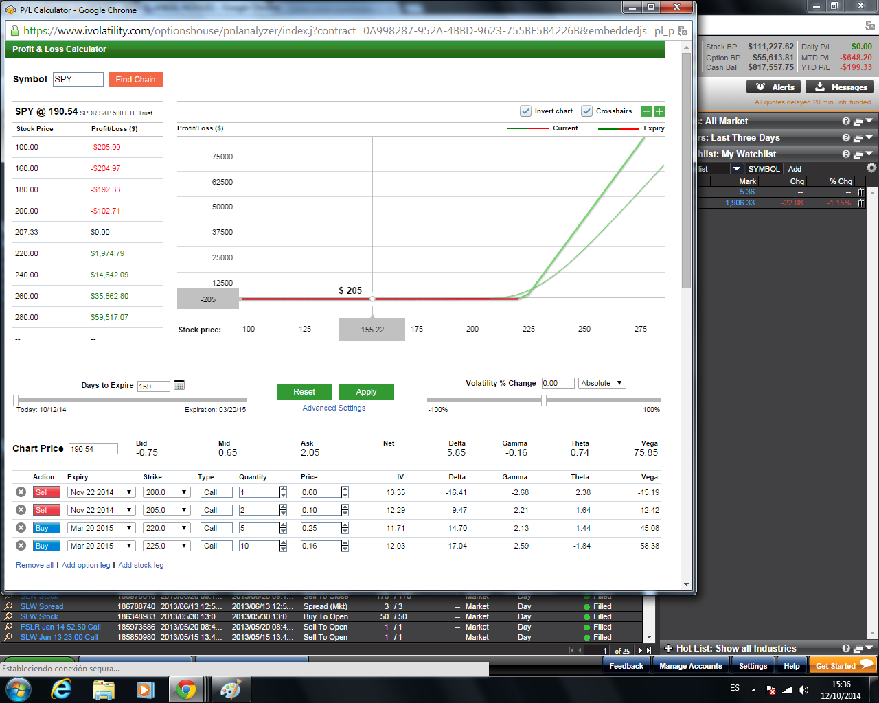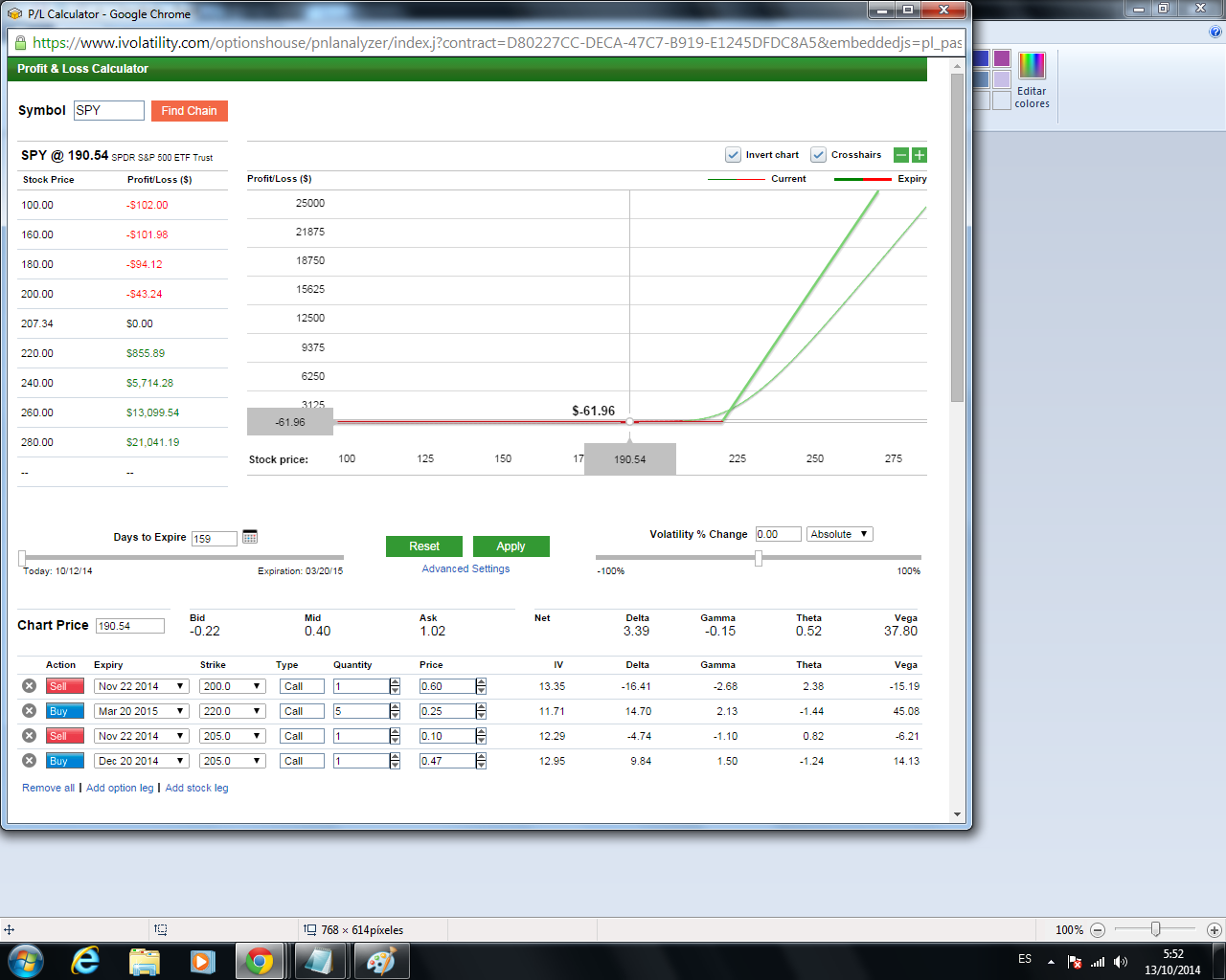 Haciendo algunos supuestos gráficos profit-loss de esta posición con posiciones hipotéticas en SPY con una call vendida 200 Nov/14 y cinco call compradas 220 Mzo/15 éste es el pantallazo
