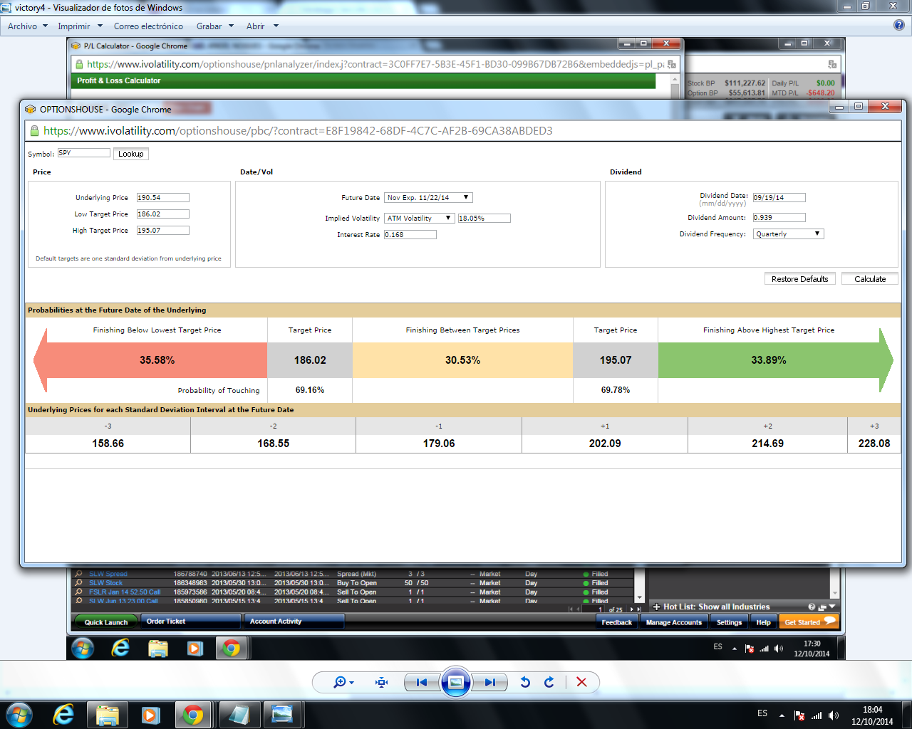 Este es el gráfico que muestra entre otras la probabilidad de que el SPY toque antes del vencimiento de Nov/14 os 195,07. Dicha probabilidad es de un 69,78%. En la última imagen más arriba vemos que a partir de 193,25 que sería el breakeven hay ya beneficios.