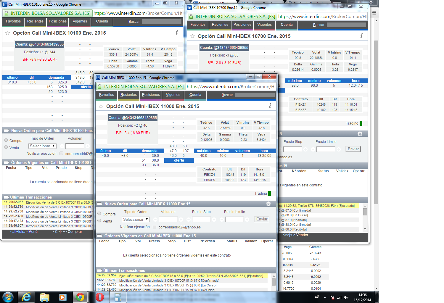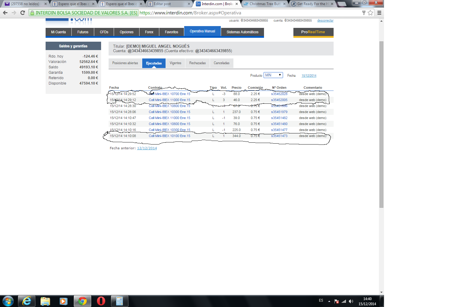 Me líé con otra estrategia que he deshecho inmediatamente a continuación por lo que en realidad son las operaciones rodeadas con círculo las correspondientes a la apertura de esta posición. O sea, compra de una call 10100 Ene/15 a 344, venta de tres call 10700 Ene/15 a 88 y compra de dos call 11000 ene/15 a 46. En total supone un pago de 175 euros de prima neta y comisiones quedando exenta de garantías.