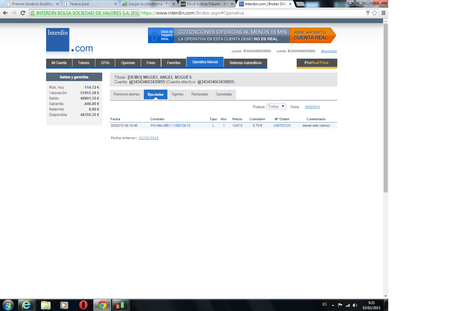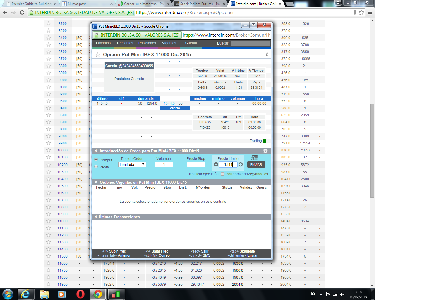 Me voy al ibex y compro una put 11000 Dic/15 y pago una prima neta de 1347,75 comisiones incluídas. Adjunto imágenes.
