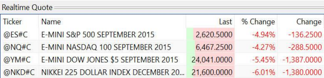 Debajo vemos la barra de tickers al cierre de ayer. En números redondos y de forma general vemos que los índices cayeron un 5%. Eso son 136 puntos en el mini SP500; o sea 6800 dólares por contrato.