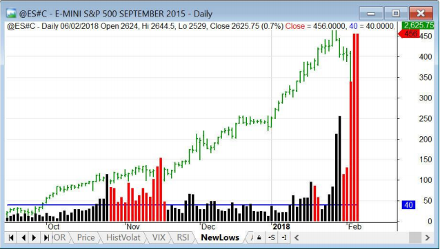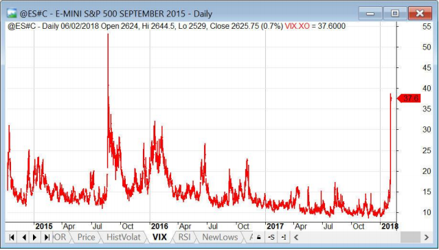 Arriba vemos los nuevos mínimos del NYSE. Ayer fueron 456, lo cual parece poco para lo que sucedió. Hace 2 años hemos registrado lecturas de 1389 así que este indicador podría empeorar. Lo mismo le pasa al VIX (debajo) que está en 37 pero en 2015 pasó de 50.